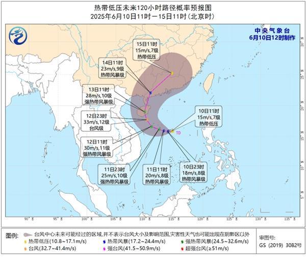 今天(6月10日),南海热带低压生成,未来可能加强为今年第1号台风,逐渐向海南岛南部到广东西部一带沿海靠近。受其影响,明天起广东将进入持续降雨模式,南部沿海等地雨势较强,雷雨时还伴有8至10级短时大风,13日至15日,全省大部有一次暴雨到大暴雨、局部特大暴雨的降水过程,公众需注意防范。